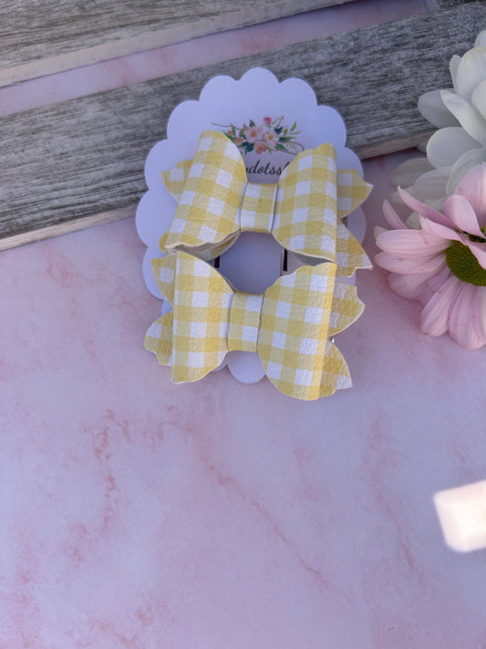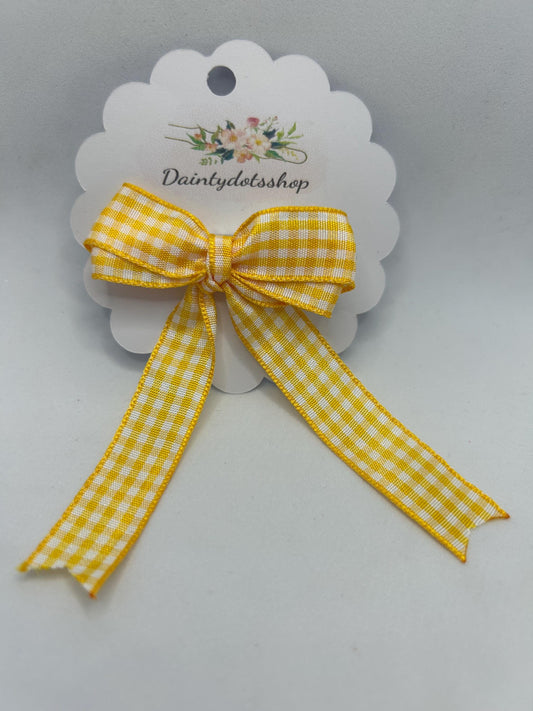 Yellow gingham ribbon bow with alligator clip. Ideal for school