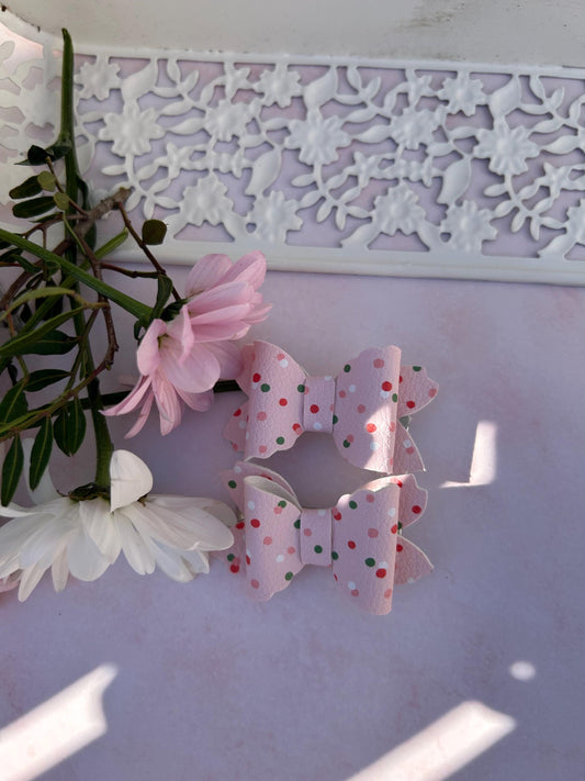 Pink Polka Dot Leather Bow Clips – Handmade Hair Accessories for Girls